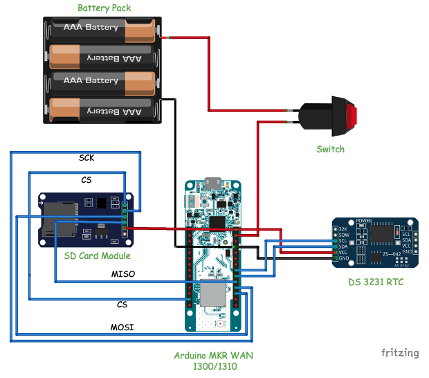The Arduino MKR WAN 1300, real time clock and SD card reader are mounted on the board: