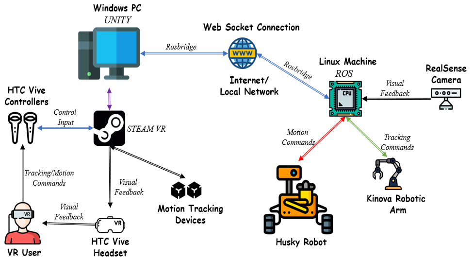 Together, these components form an integrated system for teleoperating a Husky UGV and Kinova Gen3 arm with VR technology, enabling immersive control and execution of agricultural tasks such as fruit harvesting and crop inspection with enhanced efficiency, precision, and adaptability.